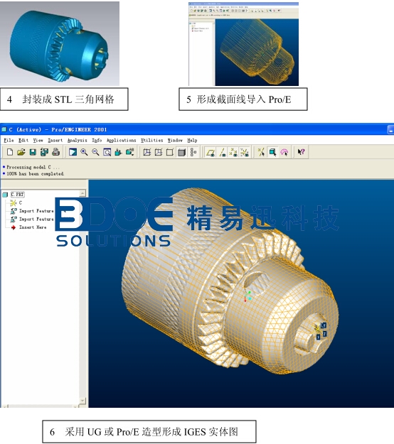 掃描后得到的點(diǎn)云數(shù)據(jù),進(jìn)一步可以封裝成 STL 三角網(wǎng)格數(shù)據(jù),截出截面線后,可以導(dǎo)入 UG, Pro/E, Catia 等 3D 造型軟件,直接造型得到可以加工的實(shí)體數(shù)據(jù)。(第 4,5 步處理時(shí)間為幾分鐘)