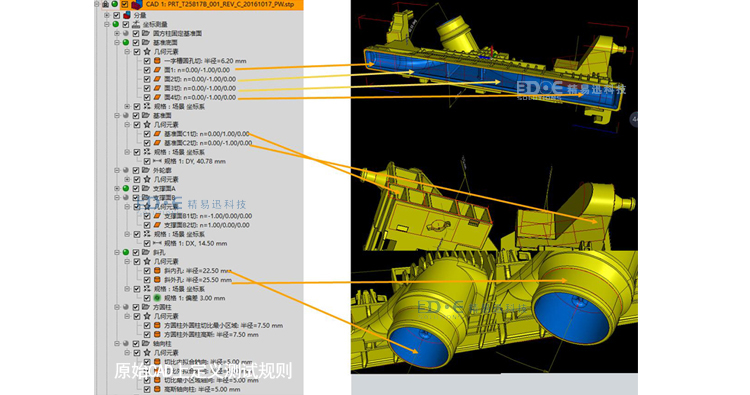 2.把原始CAD數(shù)據(jù)導(dǎo)入到精易迅3D數(shù)模檢測(cè)軟件,在原始CAD上定義測(cè)試規(guī)則,幾何元素、尺寸、計(jì)算等