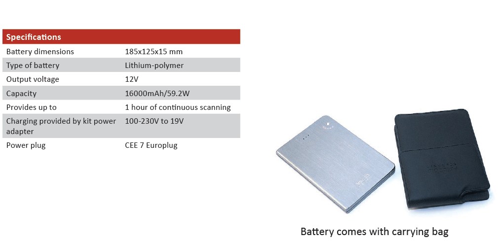 這款電池可以使您不再為無法找到電源而煩惱,可以使您隨時隨地方便操作掃描儀。合理的價格以及簡便的操作令這款電池可以幫助每個人在工作中使用3D掃描儀。只需將掃描儀連接至電池的專用接口就可以開始工作了。為了最大限度地方便使用,電池在工作時可以放置在特殊位置,甚至可以掛在腰帶上。電池的重量很輕,而且尺寸不大(185x125x15 mm),配合掃描儀使用十分方便,甚至在圍繞物體旋轉(zhuǎn)時也不會影響掃描過程。一個標(biāo)準(zhǔn)電池可以保證掃描儀一個小時不間斷掃描的供電。