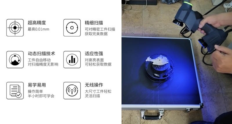 eSharp - P 11(藍(lán)光)激光手持式三維掃描儀,可視化操作(電腦顯示實(shí)時(shí)數(shù)據(jù))。高精度,高效率,可輕松實(shí)現(xiàn)對(duì)高亮表面的數(shù)據(jù)獲取,可對(duì)細(xì)小恃征精細(xì)掃描,精細(xì)模式精度可達(dá)0.01mm。在逆向設(shè)計(jì)、質(zhì)量檢測則、汽車制造、模具制造、3D打印、數(shù)字展示等中應(yīng)用廣泛。