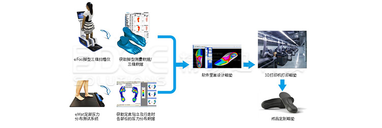 第三種就是3D打印矯形鞋墊,運用腳型3D掃描儀掃描人體自然站立狀態(tài)下的腳型3D數(shù)據(jù),采用足底壓力板收集腳底數(shù)據(jù)的受力數(shù)據(jù),發(fā)現(xiàn)足部缺陷,通過鞋墊專用的設計軟件,進行鞋墊的個性化具體設計,最后通過3D打印制作出個性化的鞋墊。根據(jù)不同人的足部掃描模型和足底壓力分布設計制作矯形鞋墊,可以滿足每個人不同的需求。相比傳統(tǒng)方法,具有高效、快速、科學化、數(shù)字化、個性化的優(yōu)勢,符合當前市場需求。