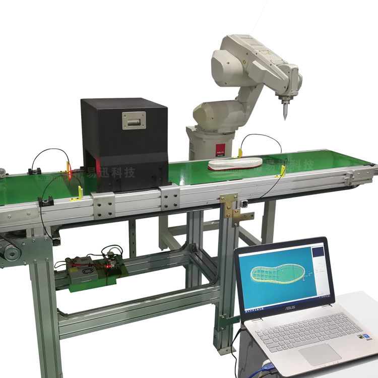 eProfile鞋底自動(dòng)噴膠系統(tǒng)可以實(shí)現(xiàn)流水線上鞋底的3D自動(dòng)掃描,獲取高精度三維空間數(shù)據(jù),進(jìn)一步形成機(jī)器人噴膠軌跡,指導(dǎo)機(jī)器人實(shí)現(xiàn)鞋底全自動(dòng)噴膠。