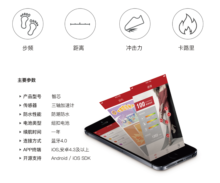 產(chǎn)品描述:Senno smart(智芯)將傳統(tǒng)鞋與智能穿戴完美結(jié)合,打造智能健康鞋,觸動(dòng)用戶真正需求痛點(diǎn)。智芯是一款采用高精度傳感器的智能芯片,能夠記錄運(yùn)動(dòng)里程、步數(shù)、卡路里消耗數(shù)據(jù),并結(jié)合專業(yè)算法,對(duì)所采集的數(shù)據(jù)進(jìn)行統(tǒng)計(jì)和分析。數(shù)據(jù)同步至手機(jī)APP,易于讀取,便于隨時(shí)掌握運(yùn)動(dòng)狀況